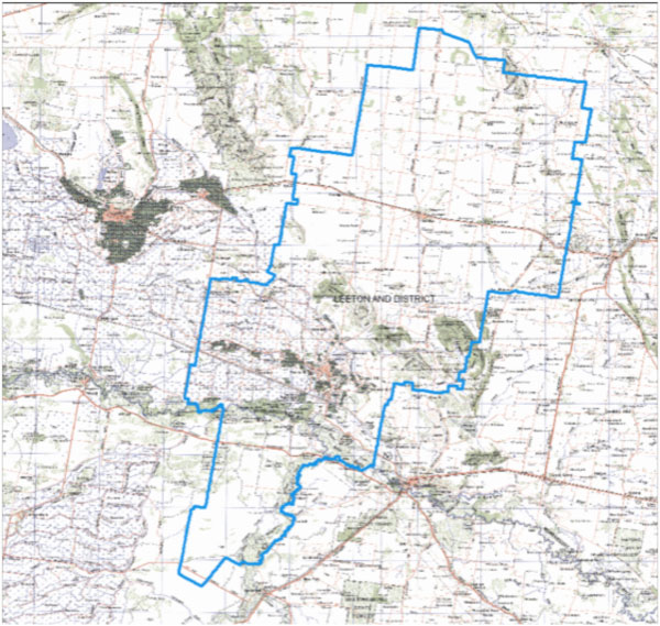 The area for which the Leeton and District Local Aboriginal Land Council has responsibility is shown on the map below and totals about 3,500 km2.