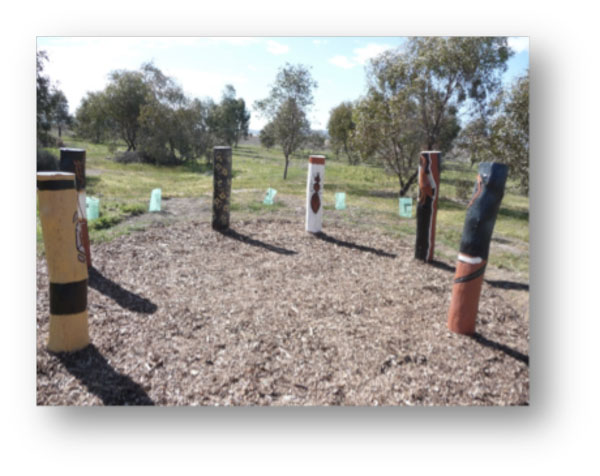 Images depicted on these poles below are associated with Fivebough Wetlands. Each pole has a story or meaning attached to it.